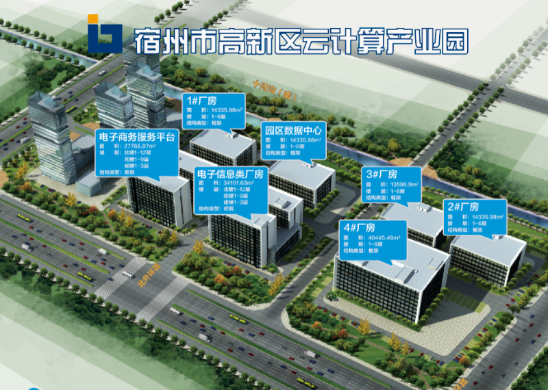 空间组成:建设4栋工业厂房、1栋数据中心厂房、1栋电子信息类厂房、1电子商务服务平台